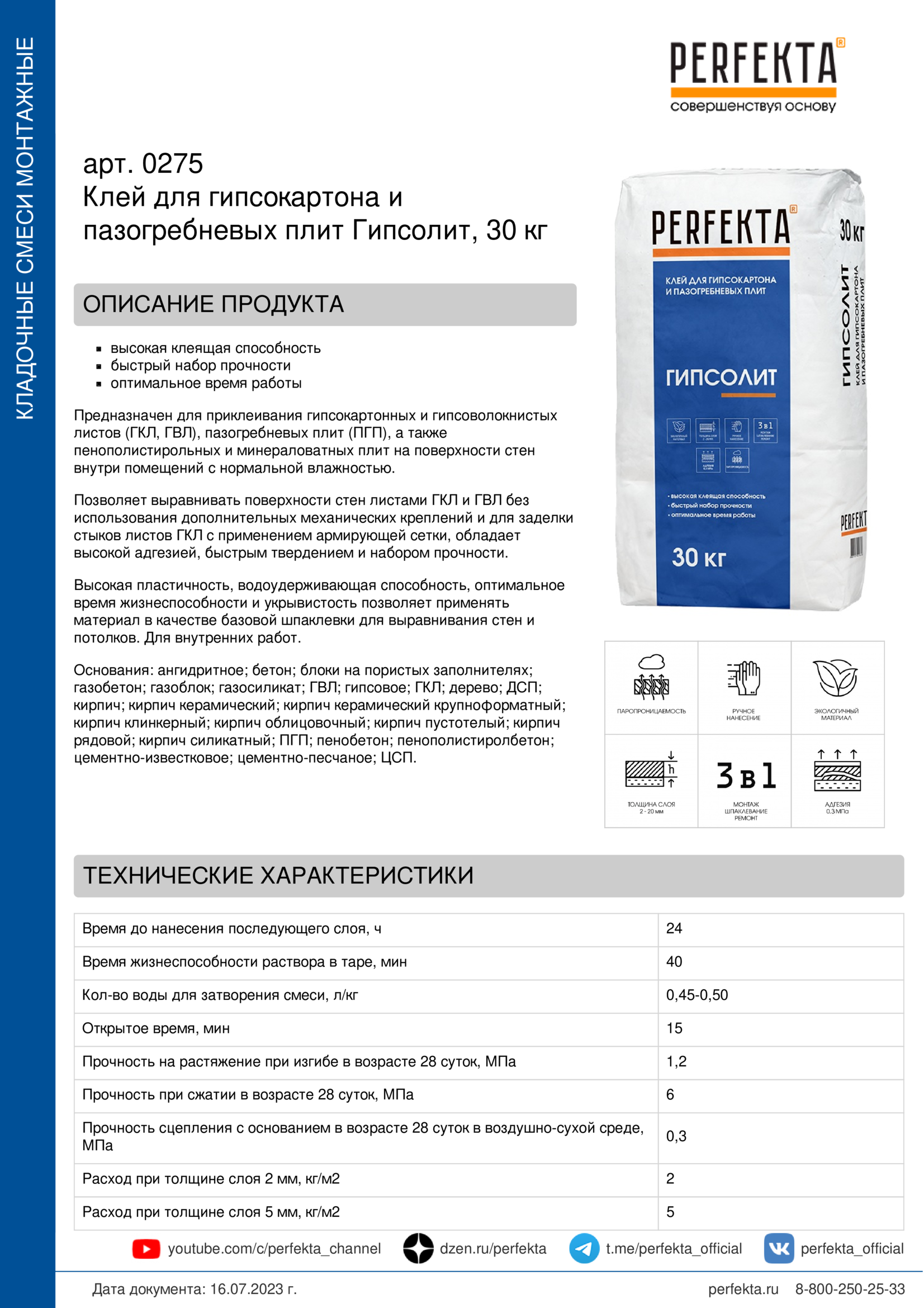 Все рекомендации и технические характеристики верны при температуре окружающей среды +20°С и относительной влажности 60 %. Качество материала гарантируется только при точном соблюдении инструкции производителя по технологии применения и требований СНиП и СП. Данная инструкция теряет силу после появления новой версии на сайте perfekta.ru.