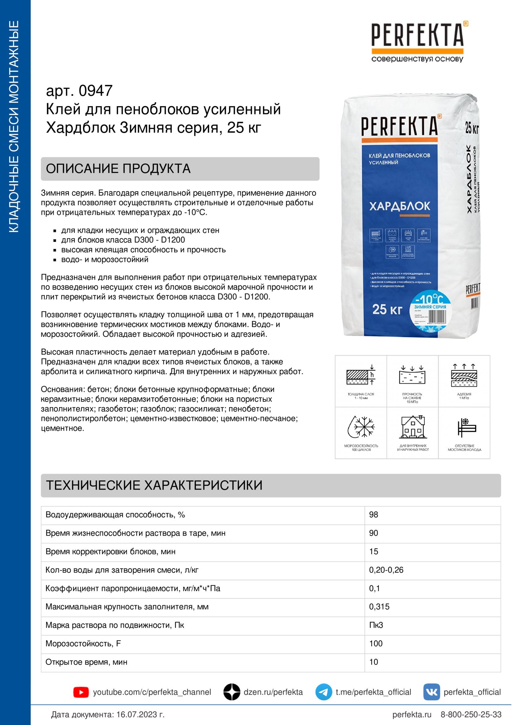 Зимняя серия. Благодаря специальной рецептуре, применение данного продукта позволяет осуществлять строительные и отделочные работы при отрицательных температурах до -10°С.
