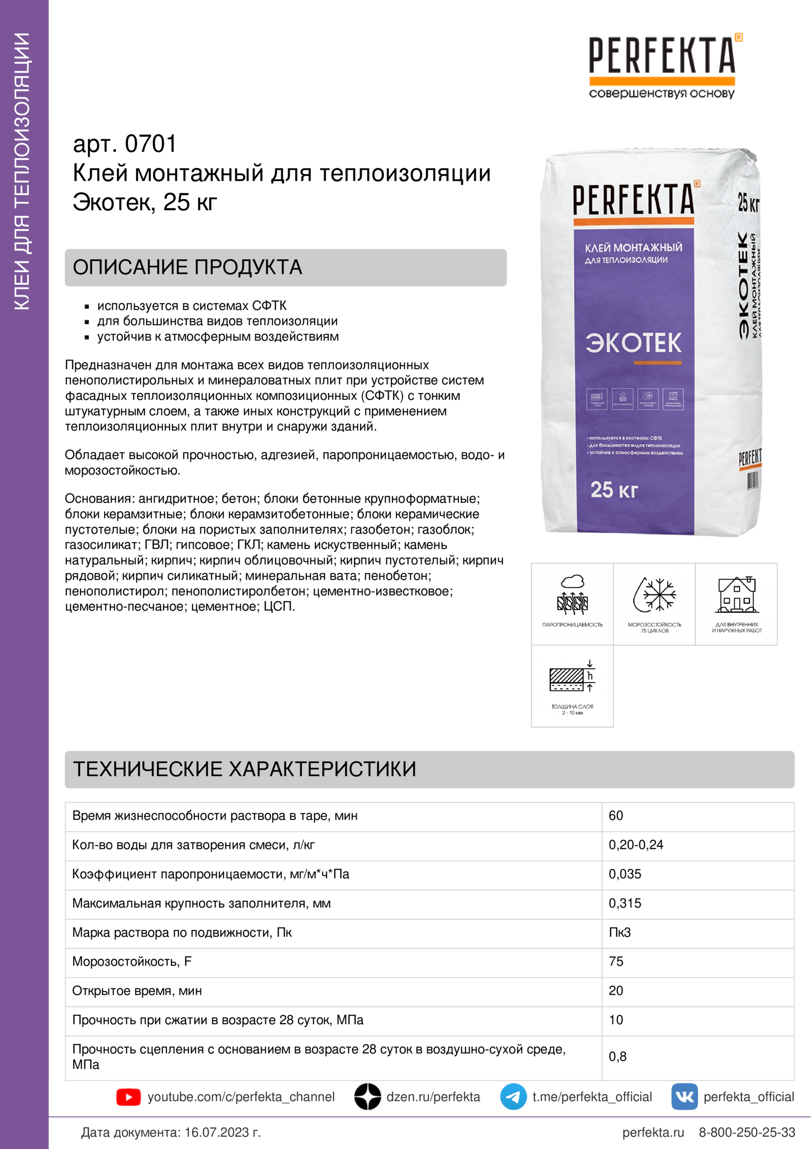 Все рекомендации и технические характеристики верны при температуре окружающей среды +20°С и относительной влажности 60 %. Качество материала гарантируется только при точном соблюдении инструкции производителя по технологии применения и требований СНиП и СП. Данная инструкция теряет силу после появления новой версии на сайте perfekta.ru.