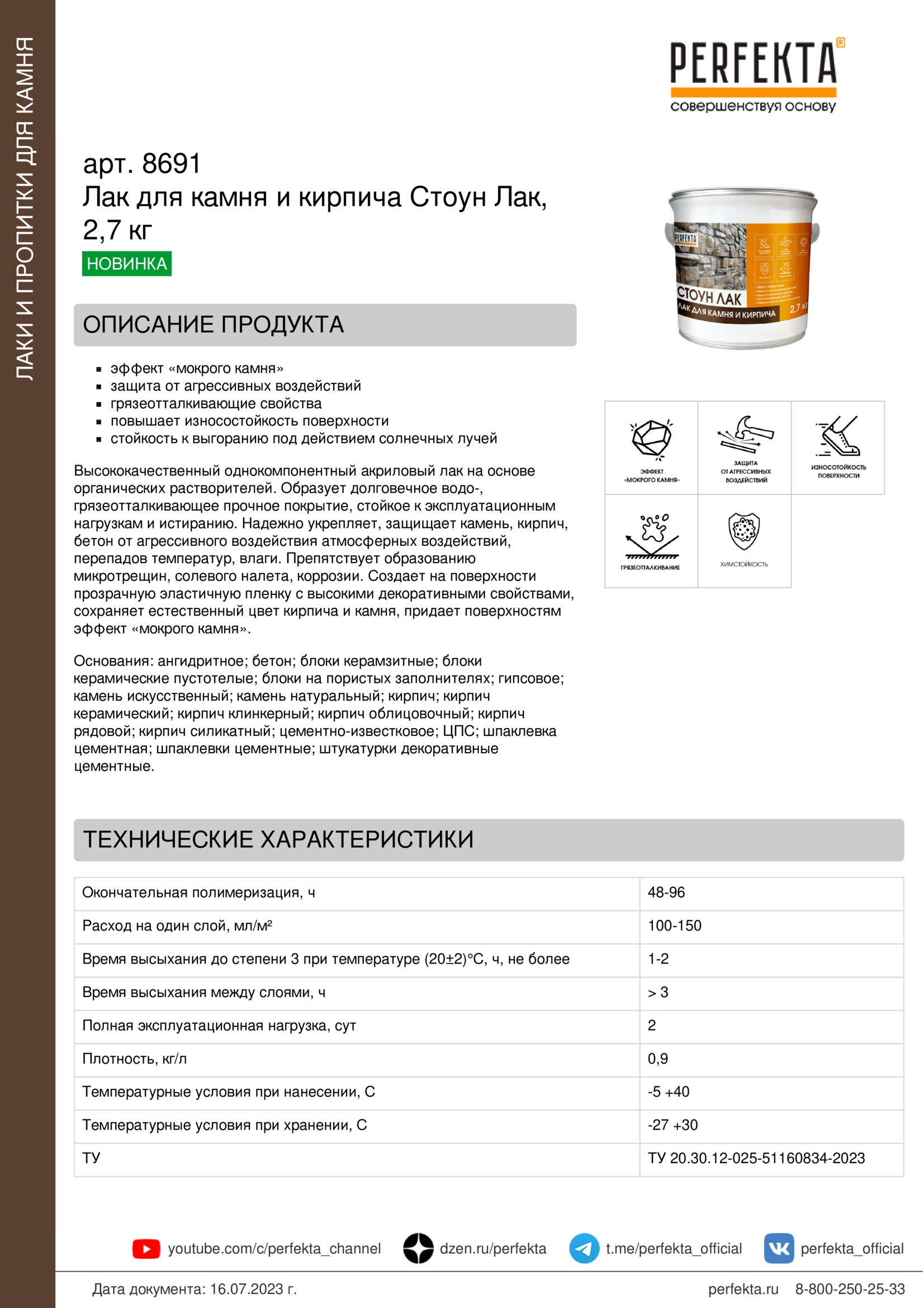 Высококачественный однокомпонентный акриловый лак на основе органических растворителей. Образует долговечное водо-, грязеотталкивающее прочное покрытие, стойкое к эксплуатационным нагрузкам и истиранию. Надежно укрепляет, защищает камень, кирпич, бетон от агрессивного воздействия атмосферных воздействий, перепадов температур, влаги. Препятствует образованию микротрещин, солевого налета, коррозии. Создает на поверхности прозрачную эластичную пленку с высокими декоративными свойствами, сохраняет естественный цвет кирпича и камня, придает поверхностям эффект «мокрого камня».