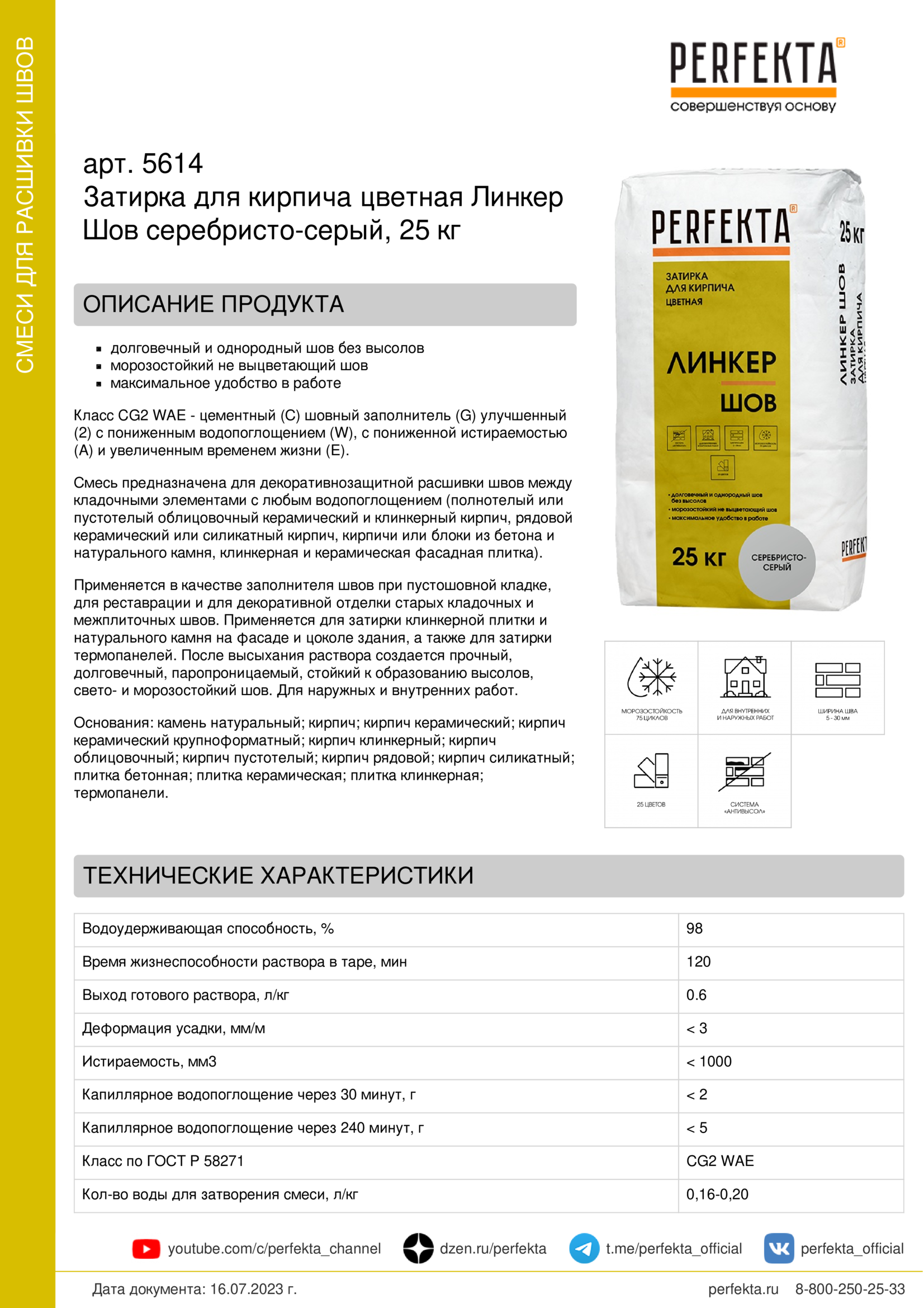 Полусухое применение: Уложить небольшое количество приготовленного раствора на поверхность расшивочного подноса и приложить край подноса к шву. Затем с помощью узкого шпателя нанести раствор в два приема, по методу «свежее по свежему» и распределить в него раствор равномерным слоем по поверхности. Декоративная расшивка шва при этом возможна одновременно с нанесением раствора. Свежеуложенные швы необходимо защищать от воздействия повышенных температур, осадков, сквозняков, попадания прямых солнечных лучей и мороза. После полного высыхания раствора в шве, обычно через 24 часа, необходимо удалить остатки материала из шва и лицевой поверхности кирпича, при помощи сухой мягкой щетки или кисти. Для получения идеального результата рекомендуется дополнительная защита шва при помощи гидрофобизатора для кирпича и бетона PERFEKTA Линкер Аквабарьер. Работы допускается производить при температуре воздуха и кладочных элементов не ниже +5°С и не выше +30°С. Свежеуложенную кладку и швы необходимо защищать от воздействия повышенных температур, осадков, сквозняков, попадания прямых солнечных лучей и мороза в течение 5-7 дней. Защиту следует производить с помощью накрывания пленкой, но при этом обеспечивать проветривание во избежание образования конденсата под пленкой. Примечание: Оттенок шва затвердевшего материала может изменяться в зависимости от погодных условий, от способа применения на строительном объекте, а также от способа формирования шва. Для точного выбора цвета раствора, рекомендуется предварительное выполнение пробной кладки.