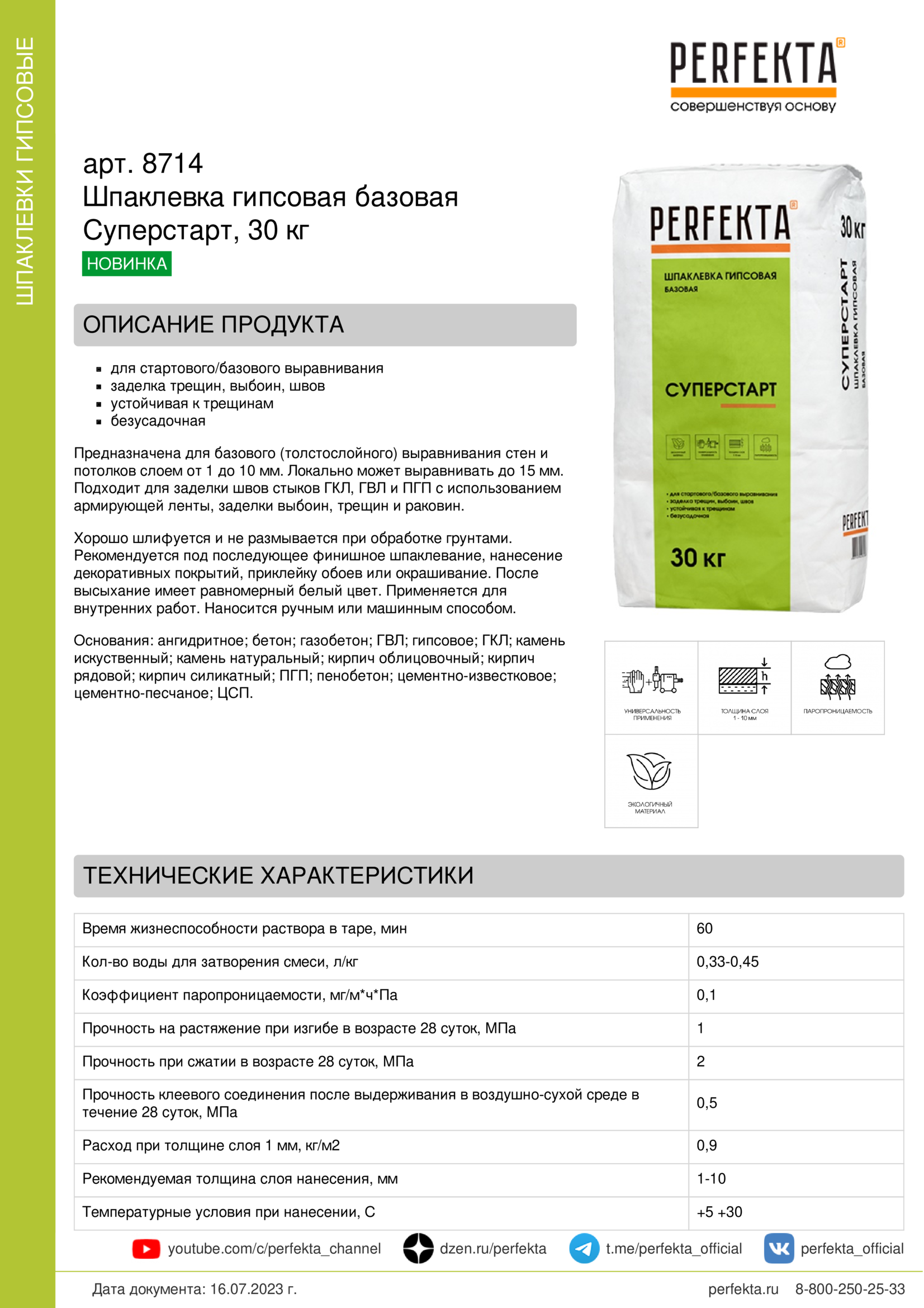 Хорошо шлифуется и не размывается при обработке грунтами. Рекомендуется под последующее финишное шпаклевание, нанесение декоративных покрытий, приклейку обоев или окрашивание. После высыхание имеет равномерный белый цвет. Применяется для внутренних работ. Наносится ручным или машинным способом.