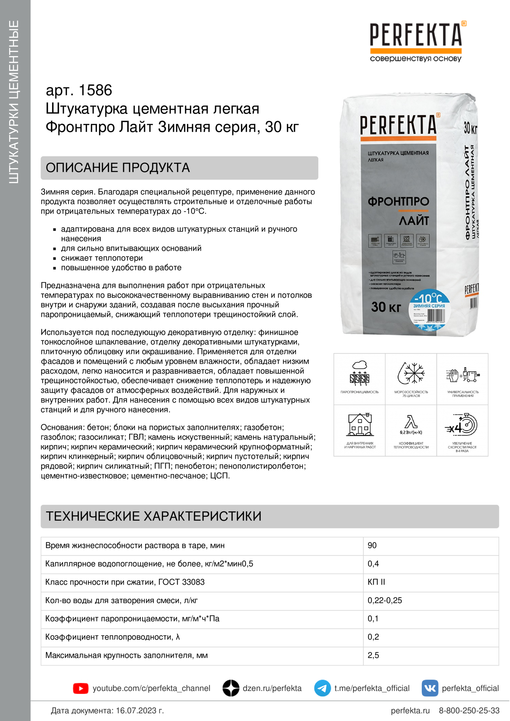 Зимняя серия. Благодаря специальной рецептуре, применение данного продукта позволяет осуществлять строительные и отделочные работы при отрицательных температурах до -10°С.