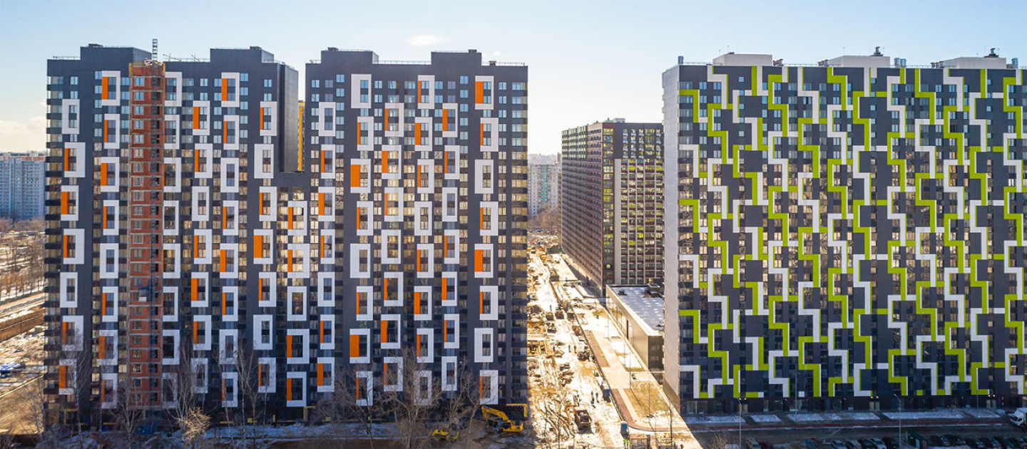 Внешняя отделка представлена вентилируемыми фасадами. Архитектурная композиция ЖК «Летний сад» подобрана удачно – массивные дома организованы аккуратными группами по 2-3 корпуса и образуют мини-кварталы с обособленными дворами. Фасады корпусов украшены объемными цветными узорами, которые объединяют окна нескольких этажей и создают эффект малоэтажности. Дома, которые расположены по периметру жилого комплекса, имеют выемку до средних этажей, разделяющую жилое строение на две равные части. Это сделано, чтобы корпуса казались менее массивными.